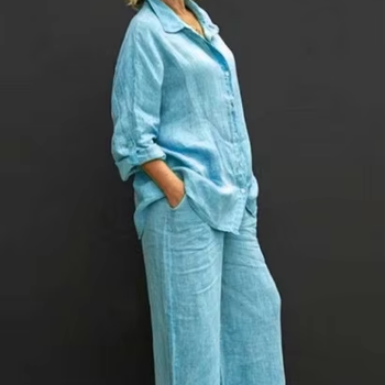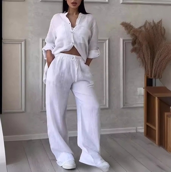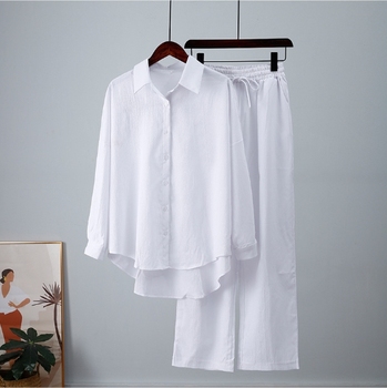 2024 Châu Âu Và Mỹ Của Phụ Nữ Thời Trang Mới Lỏng Dài Tay Áo Sơ Mi Quần Rộng Chân Bộ Giản Dị 2 Mảnh