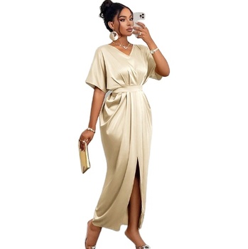 2024 nữ châu Âu và mỹ mùa thu thanh lịch cổ chữ V ngắn tay cao eo Slit váy dài